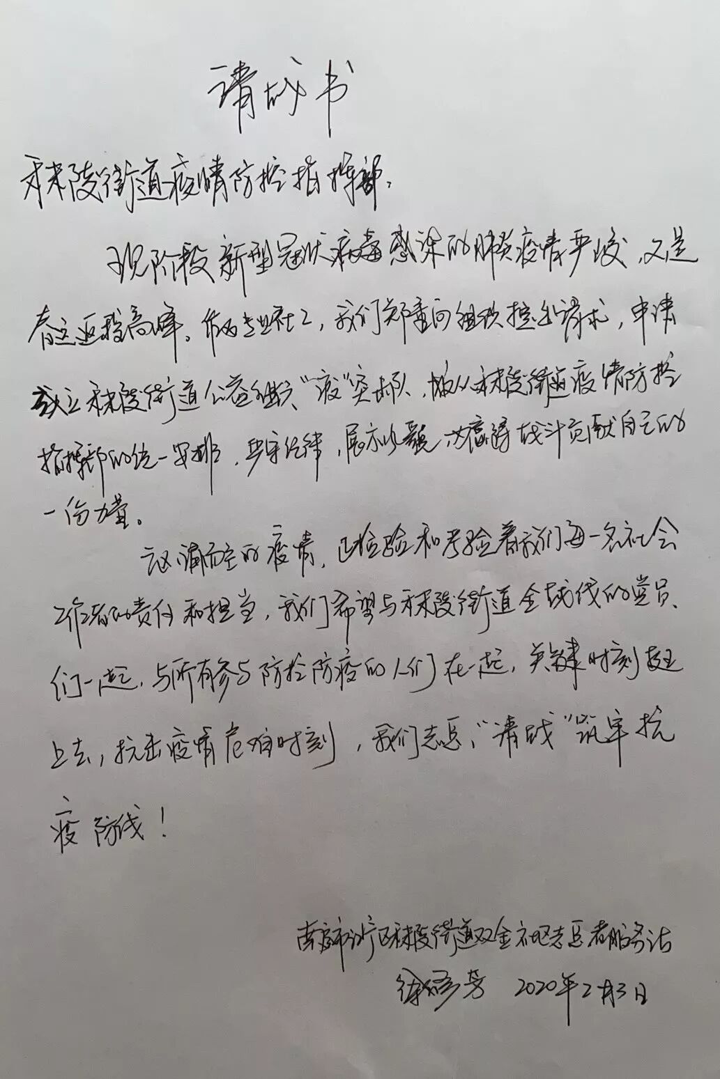 汹涌而至的疫情,正检验和考验着我们每一名社会工作者的责任和担当,我们希望与秣陵街道全战线的党员们一起,与所有参与防控防疫的人们在一起,关键时刻挺上去,抗击疫情危难时刻,我们志愿‘请战’筑牢抗疫防线!”
