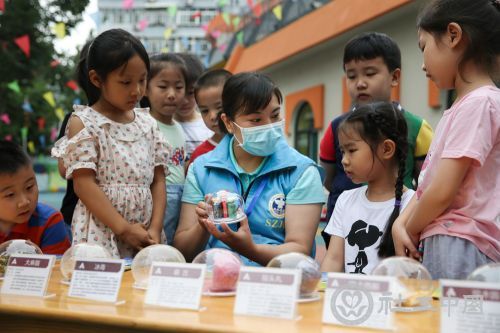 (6月12日,在济南市市中区乐山幼儿园,高建华教孩子们识别毒品。郝鑫城 摄)